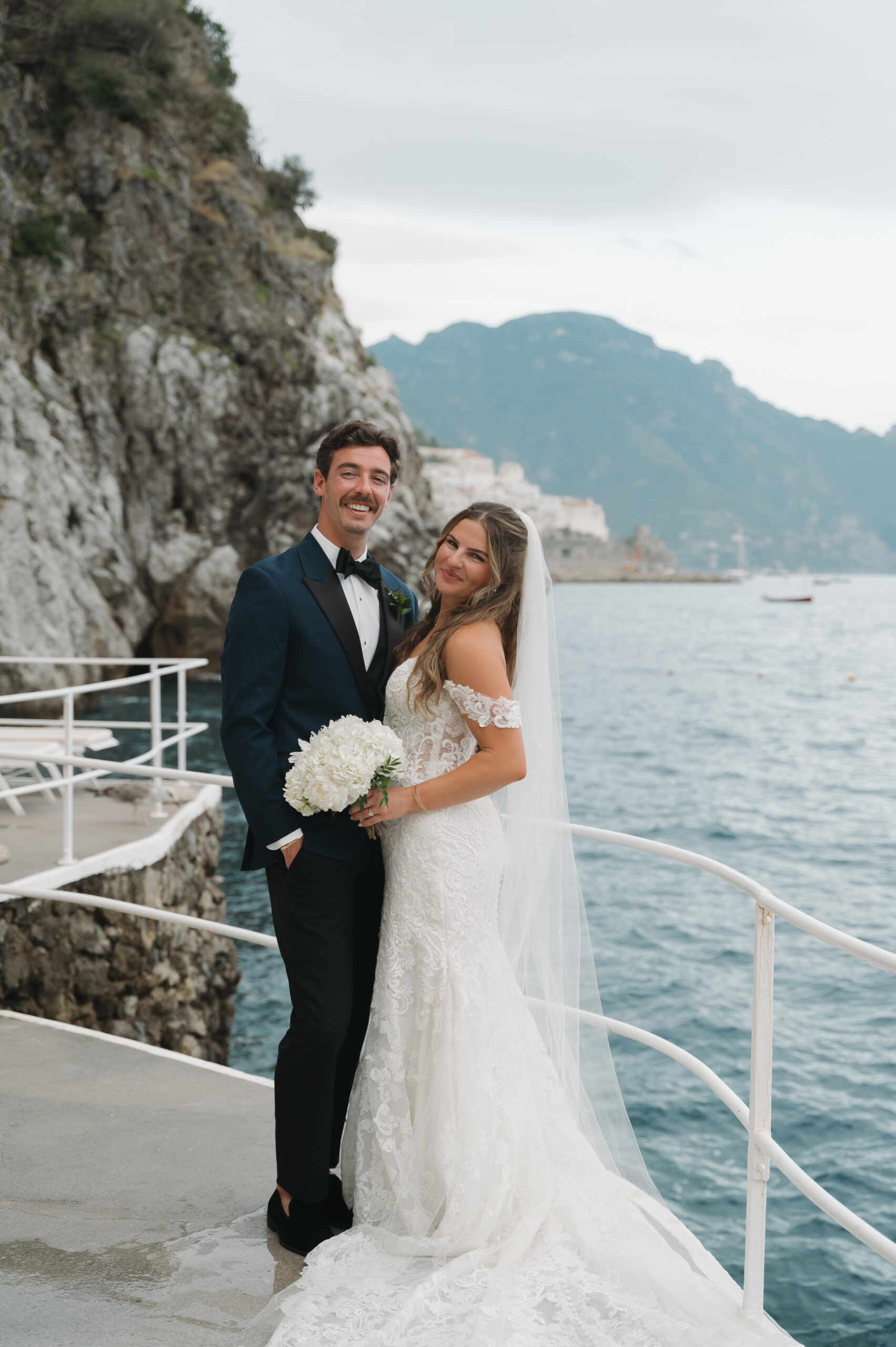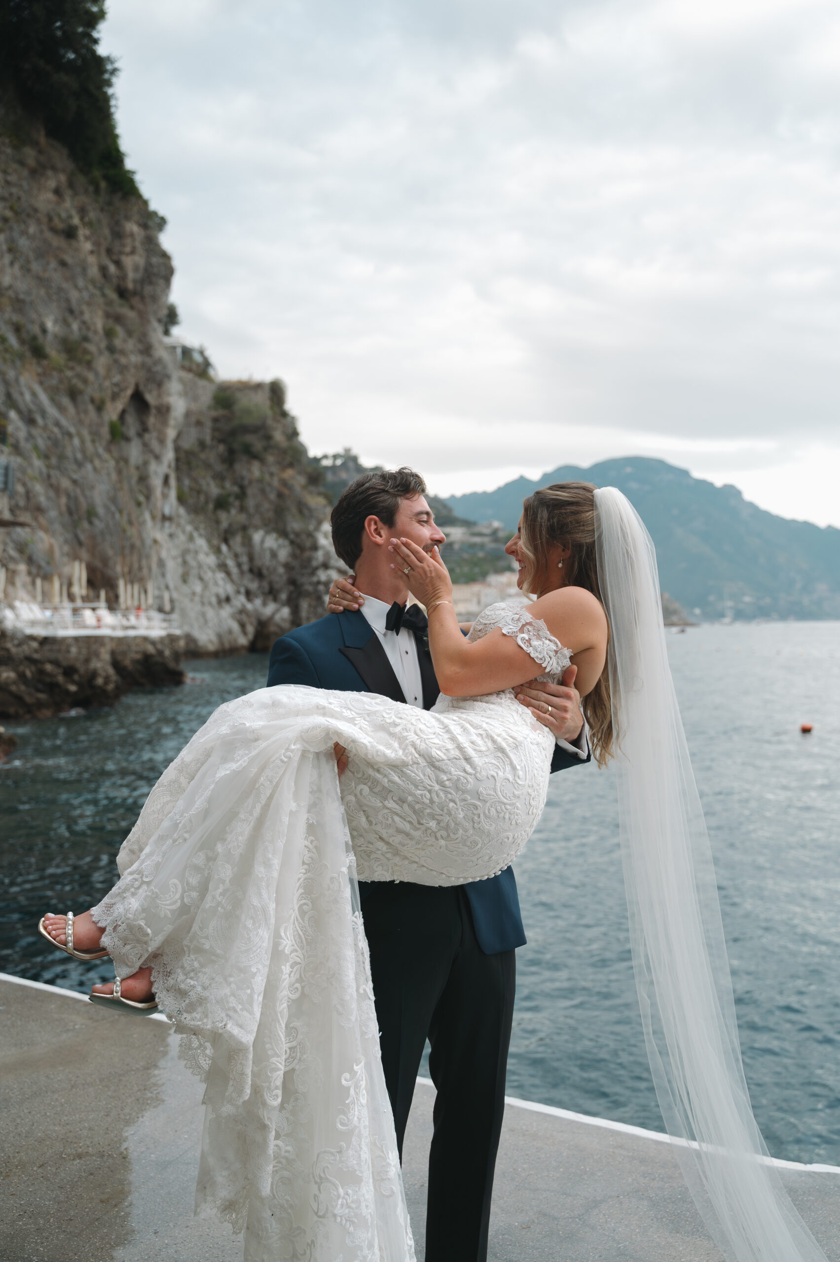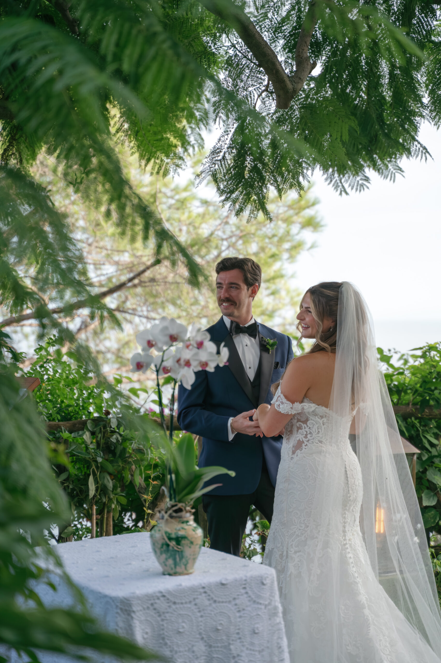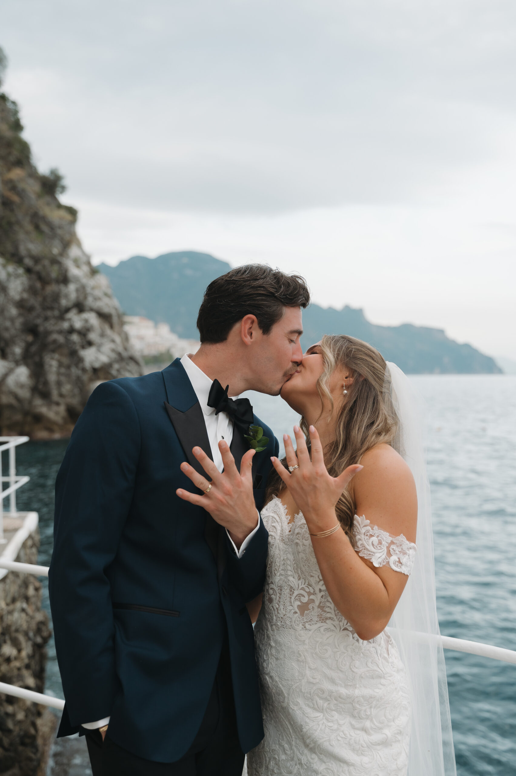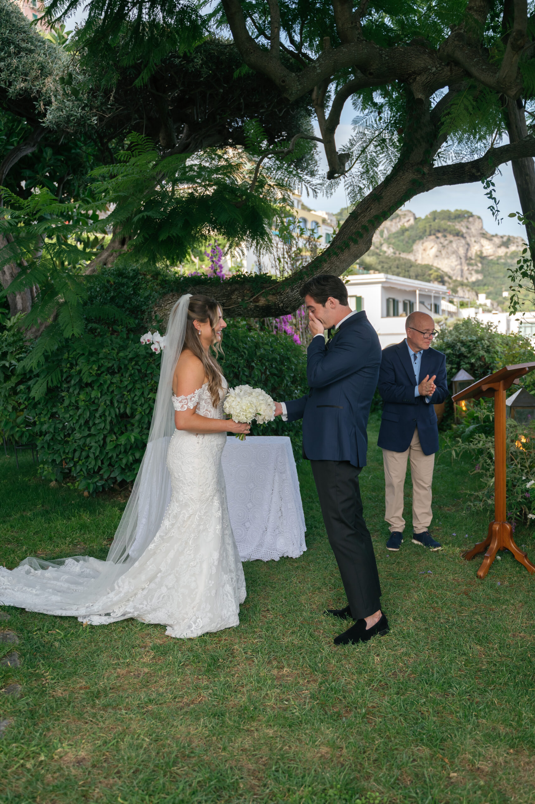 Their journey to Italy was not without obstacles – flight delays threatened to threaten their rhythm. But the team at Hotel Santa Caterina met them with kindness and grace, upgrading their room to a suite with a balcony that overlooked the sea. That room became “the moment before the moment”, the place where the dress’s lace breathed with sea air, where Mackenzie’s suit waited in soft light, where nerves and excitement softened into calm. Sometimes the universe repays hard journeys with unexpected gifts.