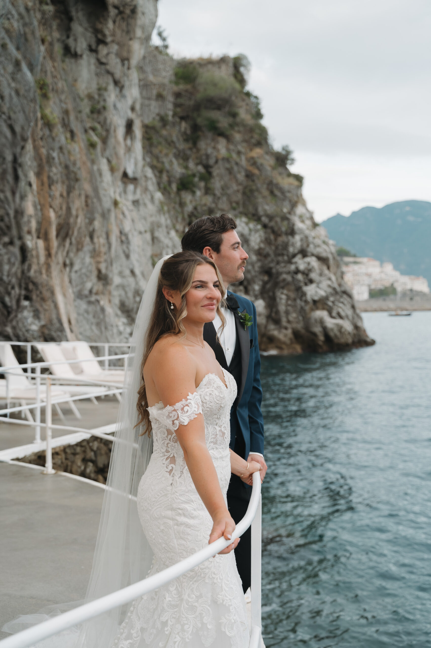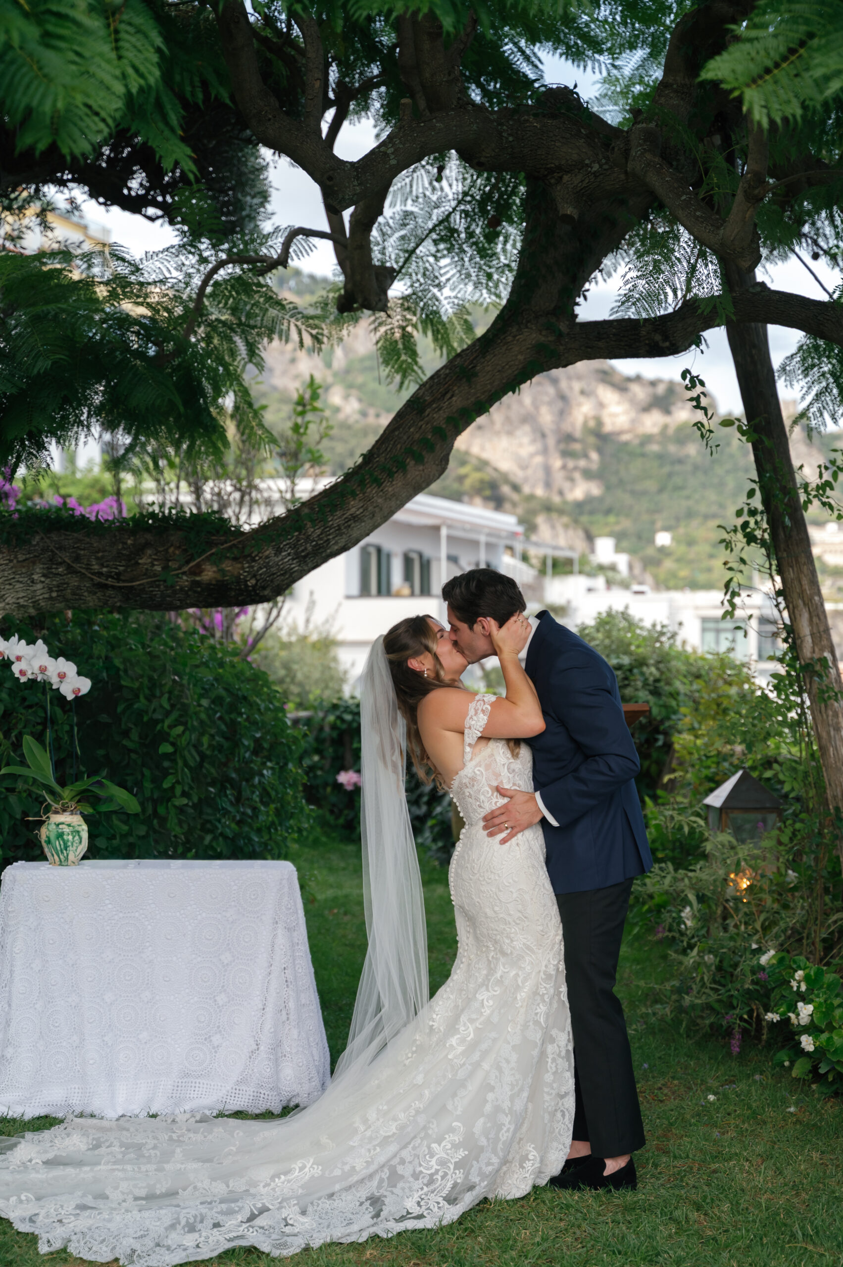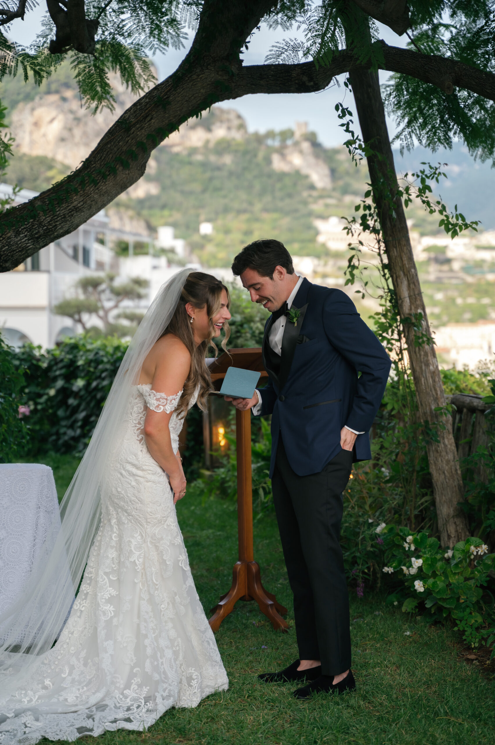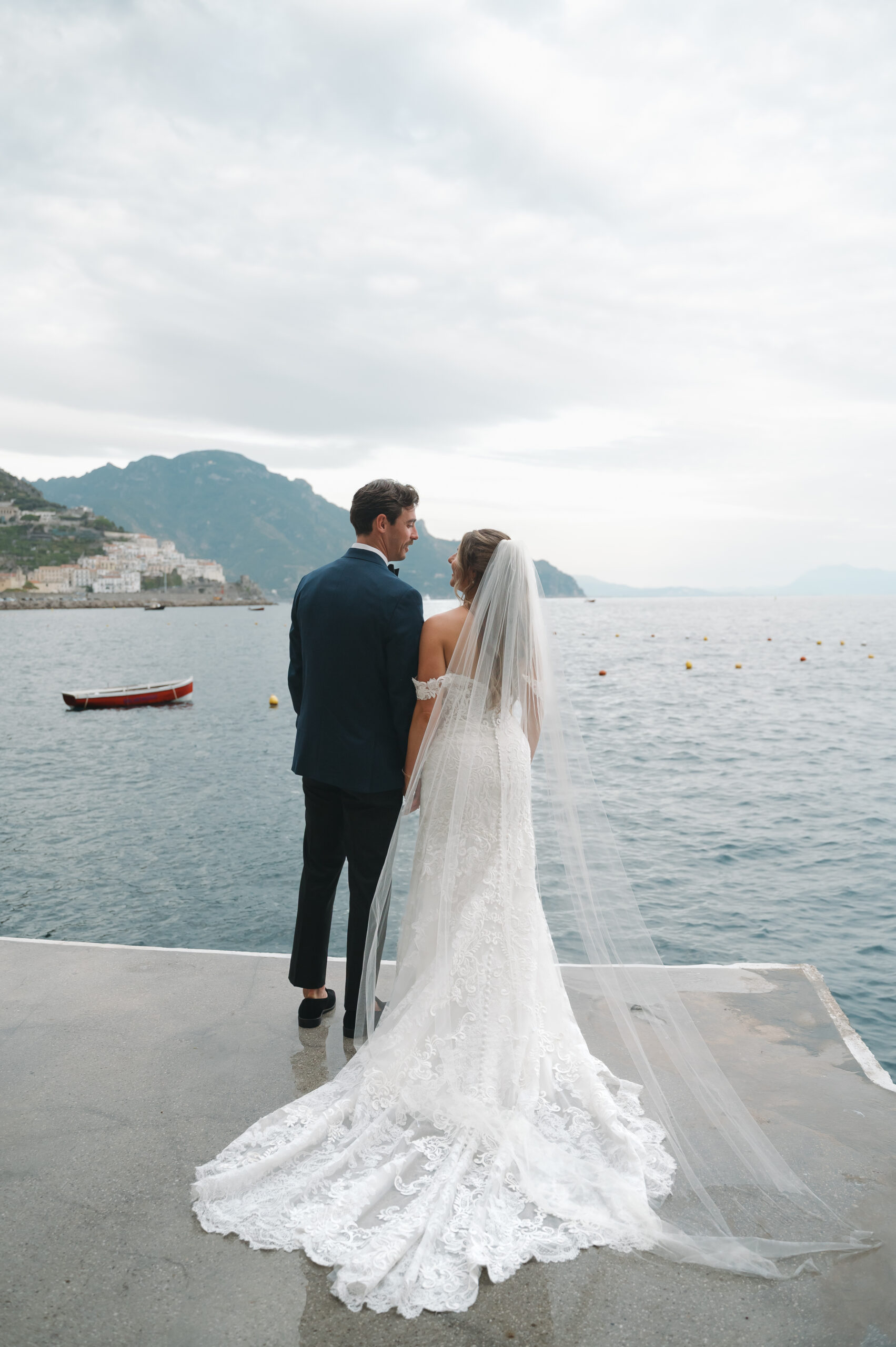 Their journey to Italy was not without obstacles – flight delays threatened to threaten their rhythm. But the team at Hotel Santa Caterina met them with kindness and grace, upgrading their room to a suite with a balcony that overlooked the sea. That room became “the moment before the moment”, the place where the dress’s lace breathed with sea air, where Mackenzie’s suit waited in soft light, where nerves and excitement softened into calm. Sometimes the universe repays hard journeys with unexpected gifts.