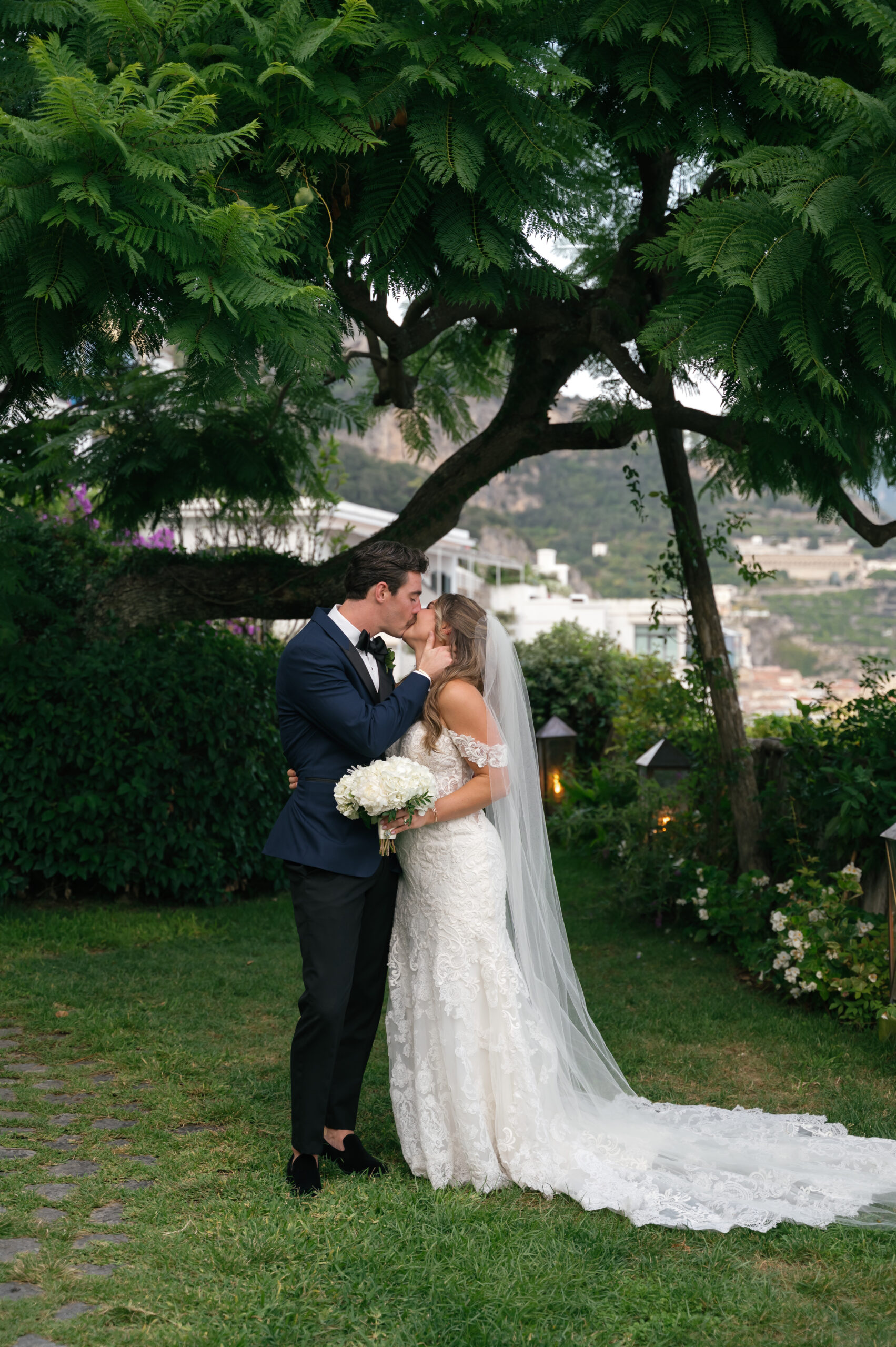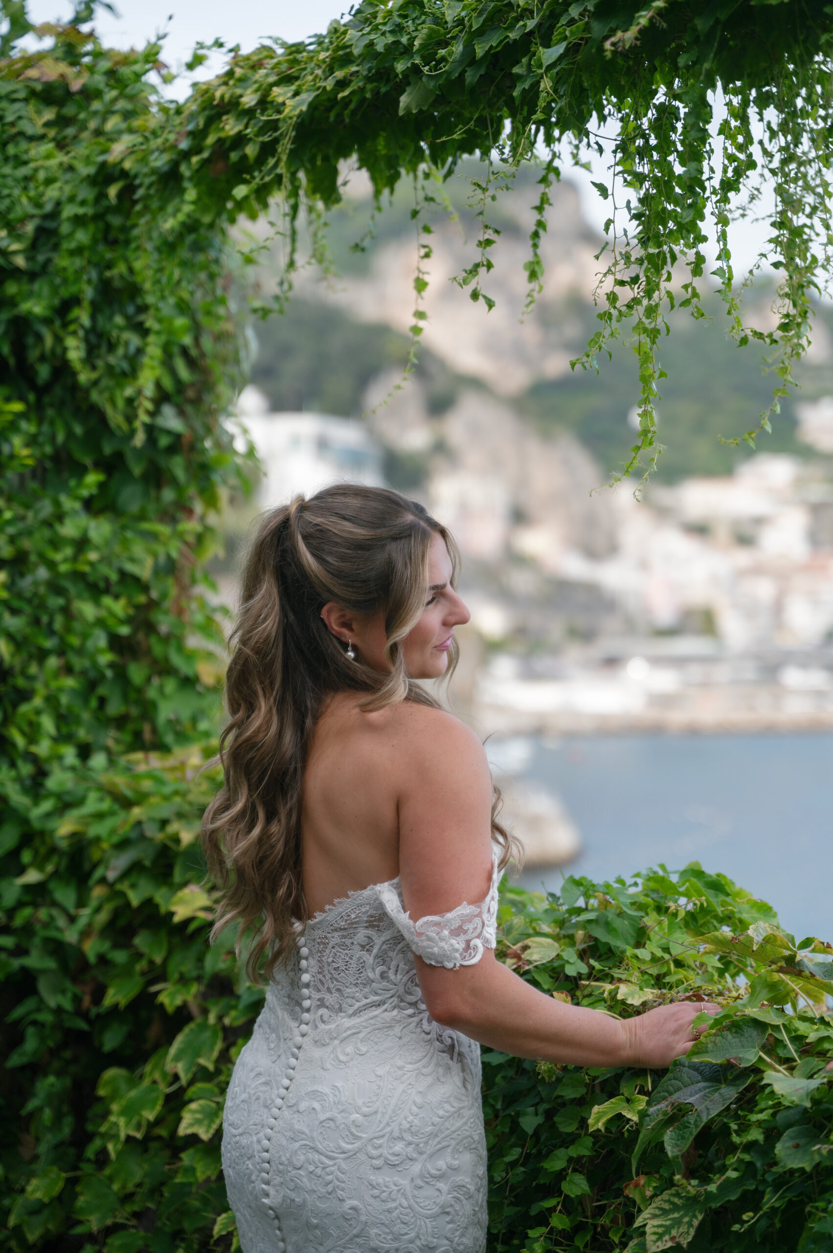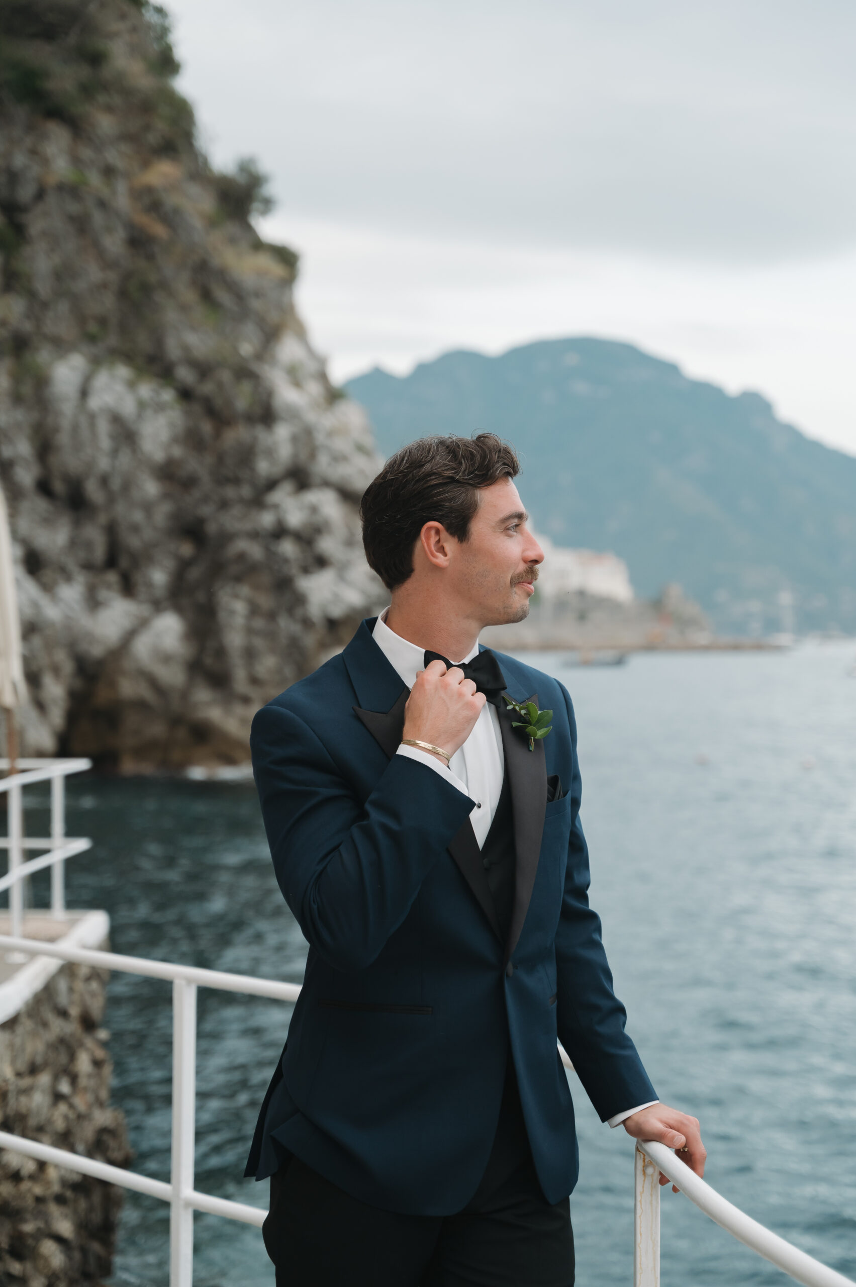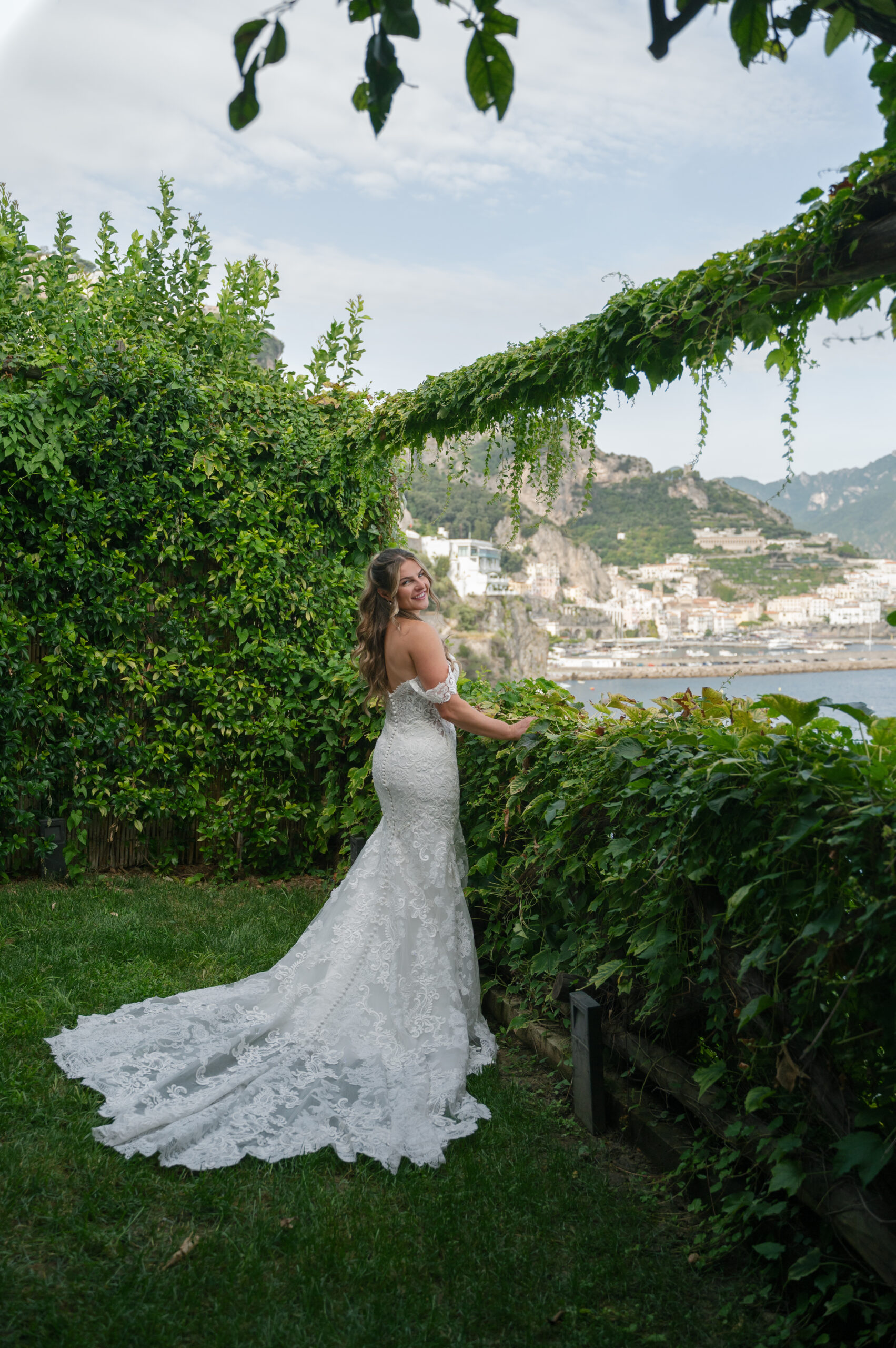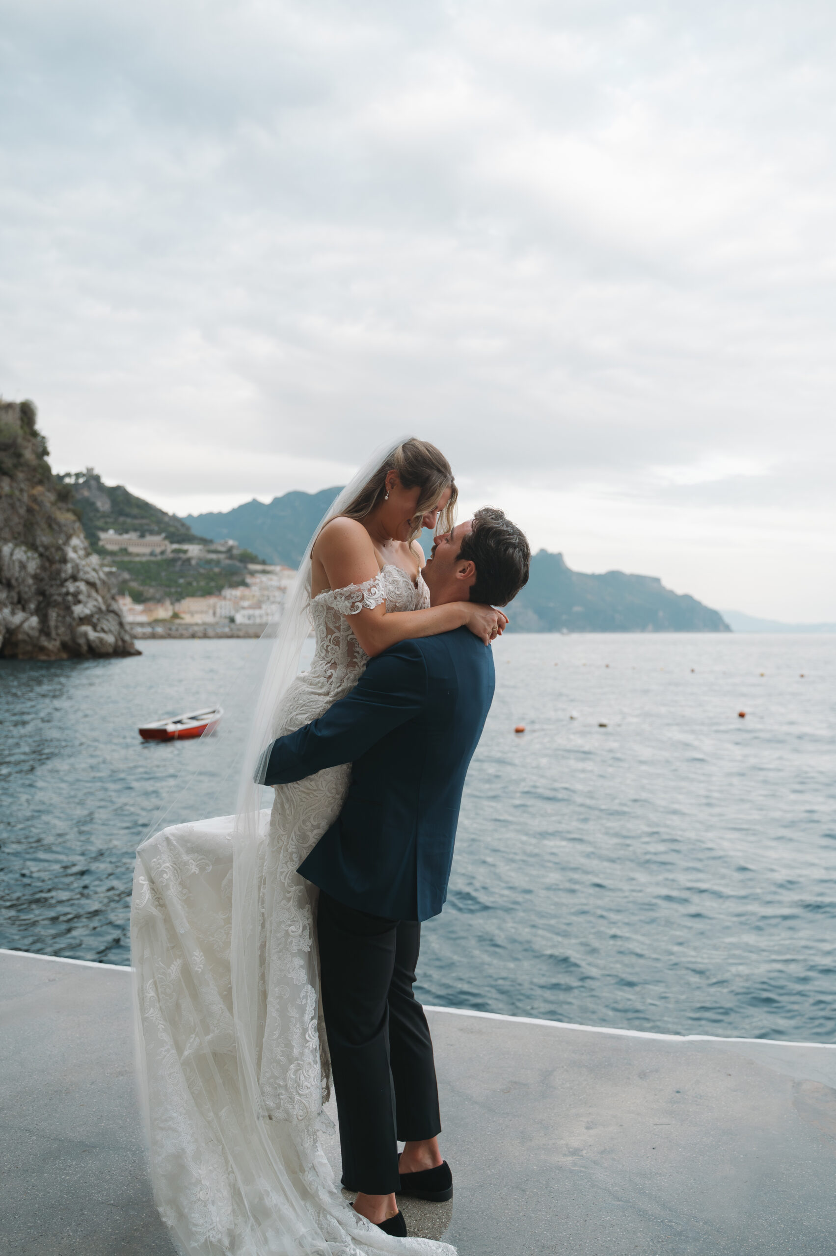 Their journey to Italy was not without obstacles – flight delays threatened to threaten their rhythm. But the team at Hotel Santa Caterina met them with kindness and grace, upgrading their room to a suite with a balcony that overlooked the sea. That room became “the moment before the moment”, the place where the dress’s lace breathed with sea air, where Mackenzie’s suit waited in soft light, where nerves and excitement softened into calm. Sometimes the universe repays hard journeys with unexpected gifts.