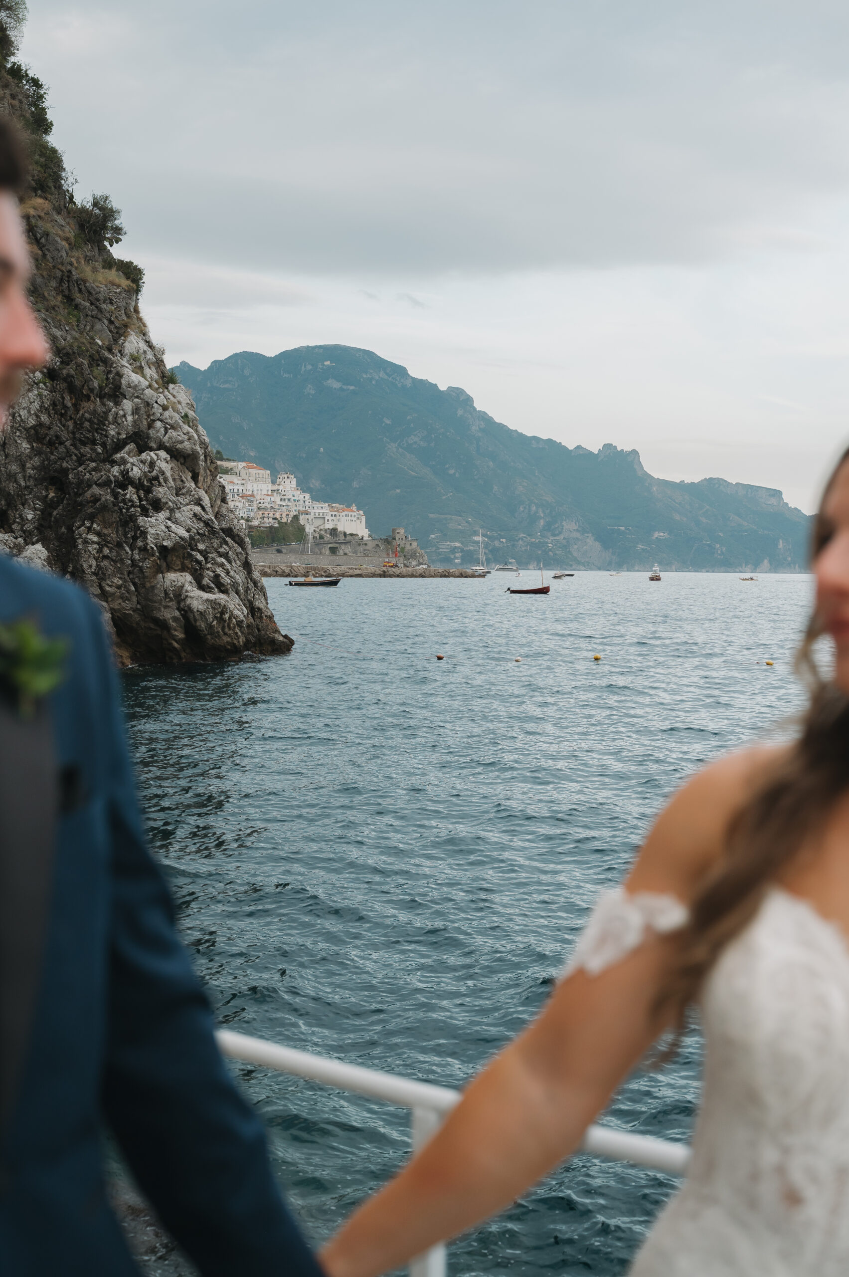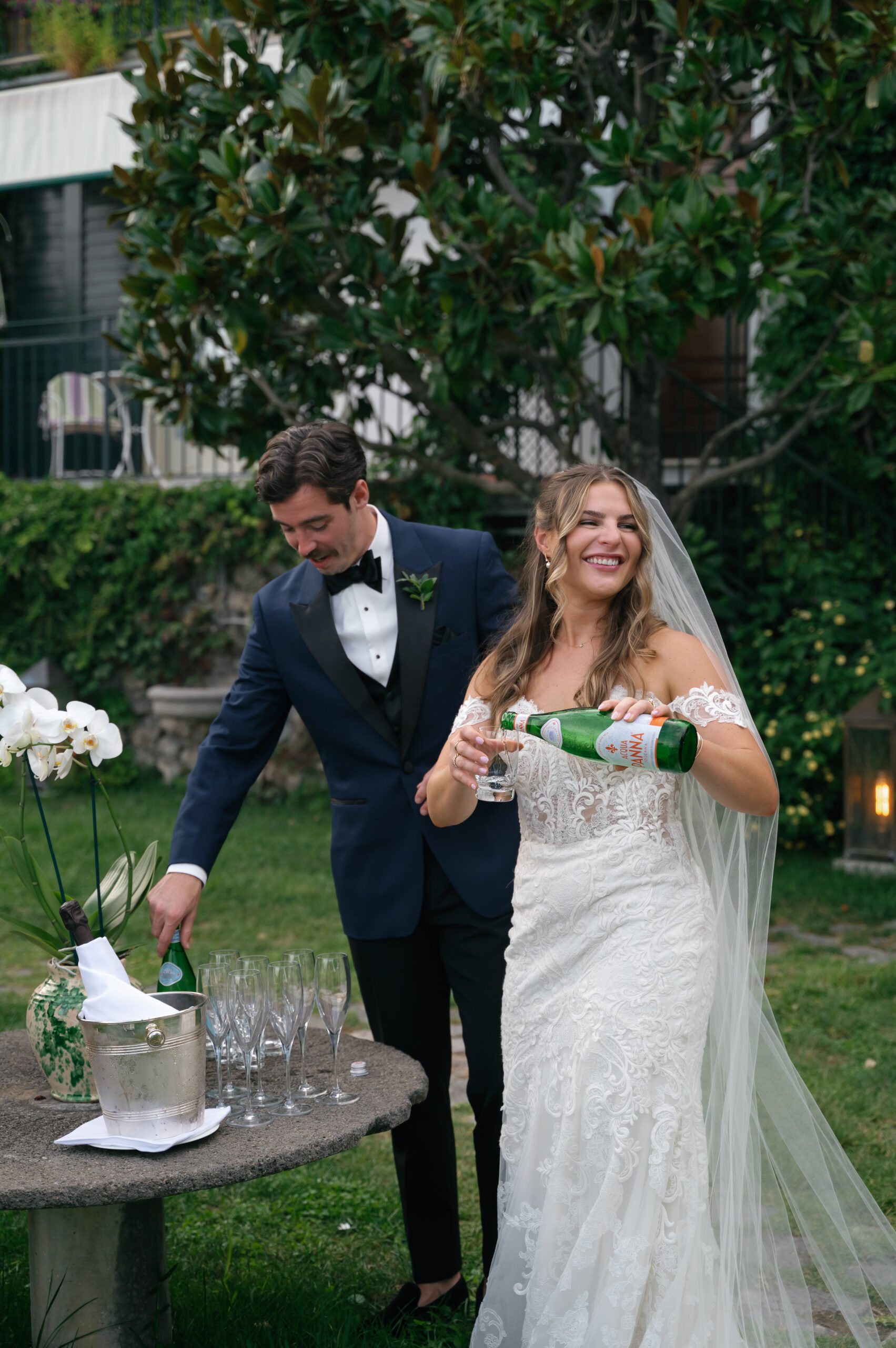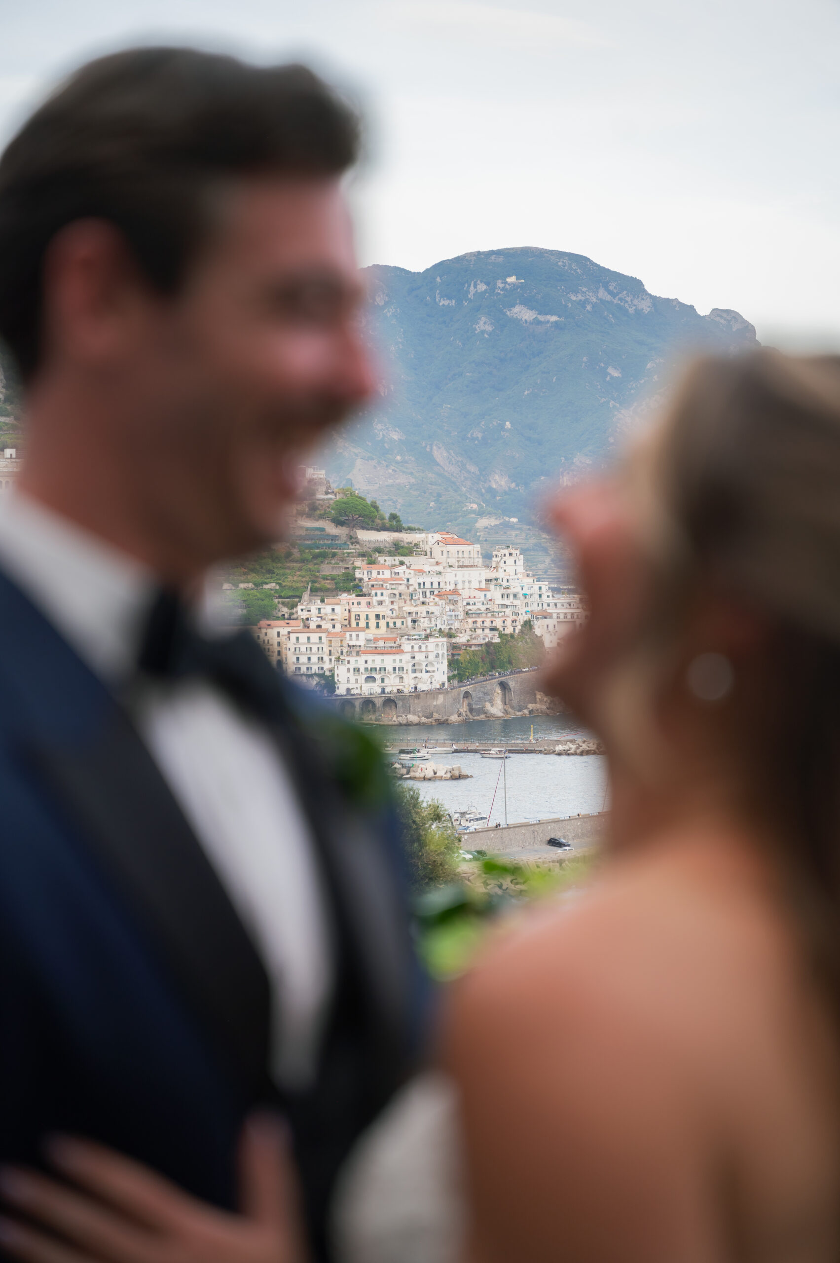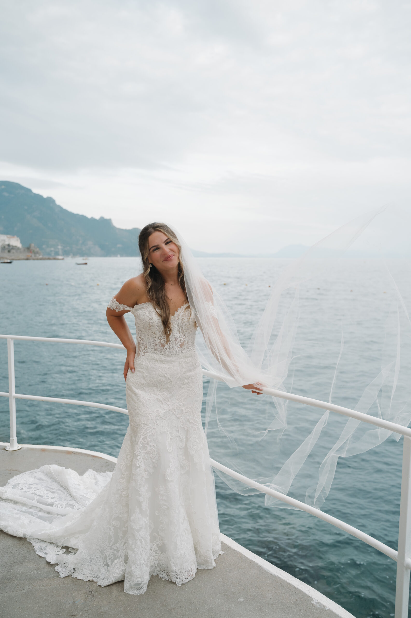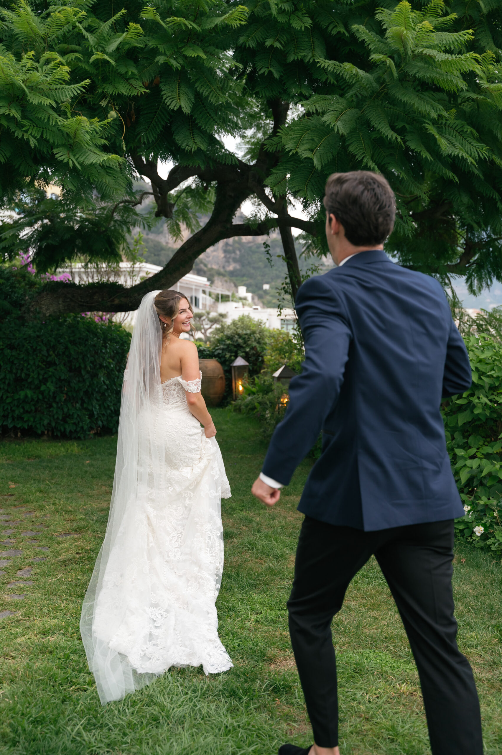 Their journey to Italy was not without obstacles – flight delays threatened to threaten their rhythm. But the team at Hotel Santa Caterina met them with kindness and grace, upgrading their room to a suite with a balcony that overlooked the sea. That room became “the moment before the moment”, the place where the dress’s lace breathed with sea air, where Mackenzie’s suit waited in soft light, where nerves and excitement softened into calm. Sometimes the universe repays hard journeys with unexpected gifts.