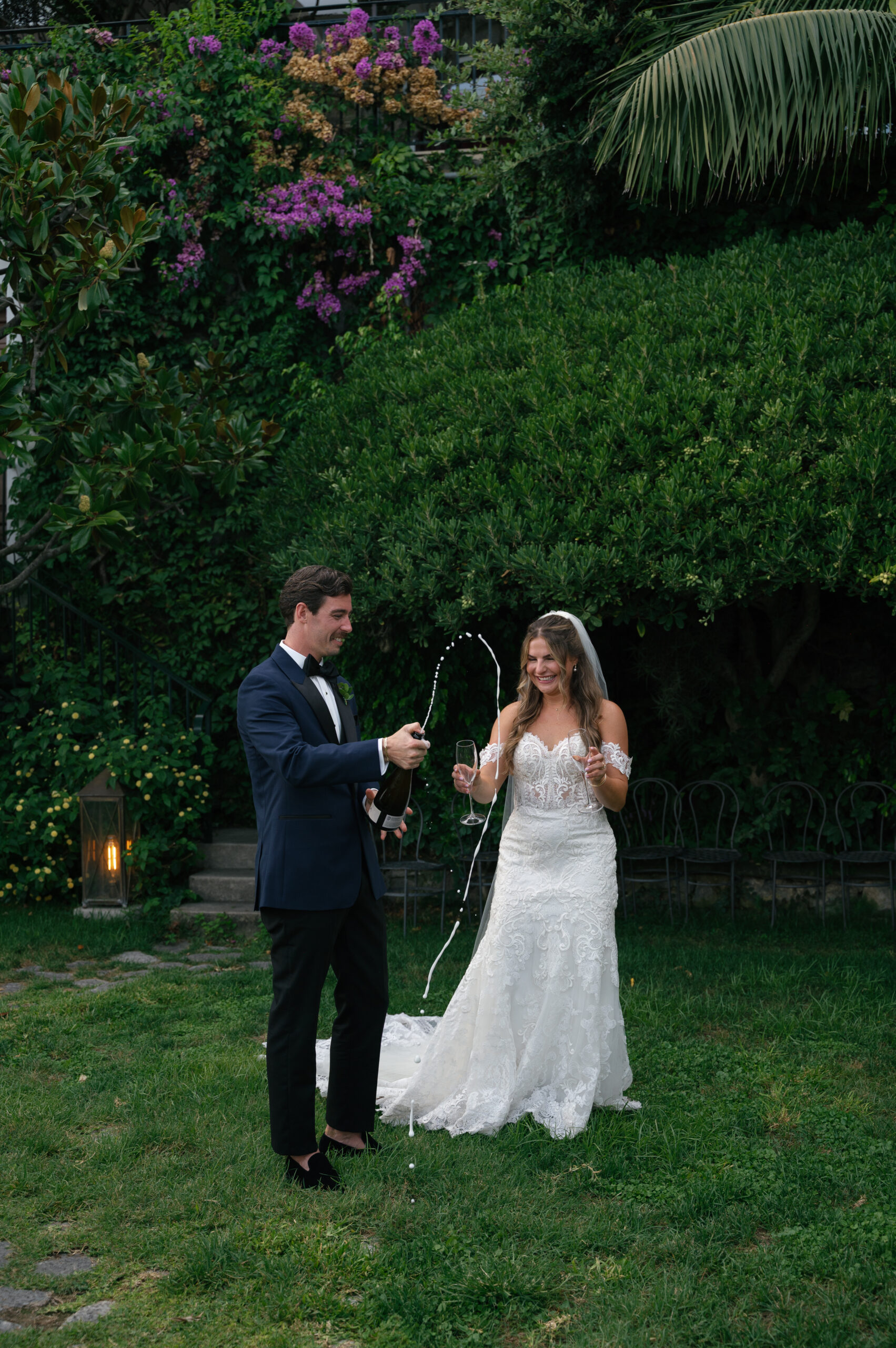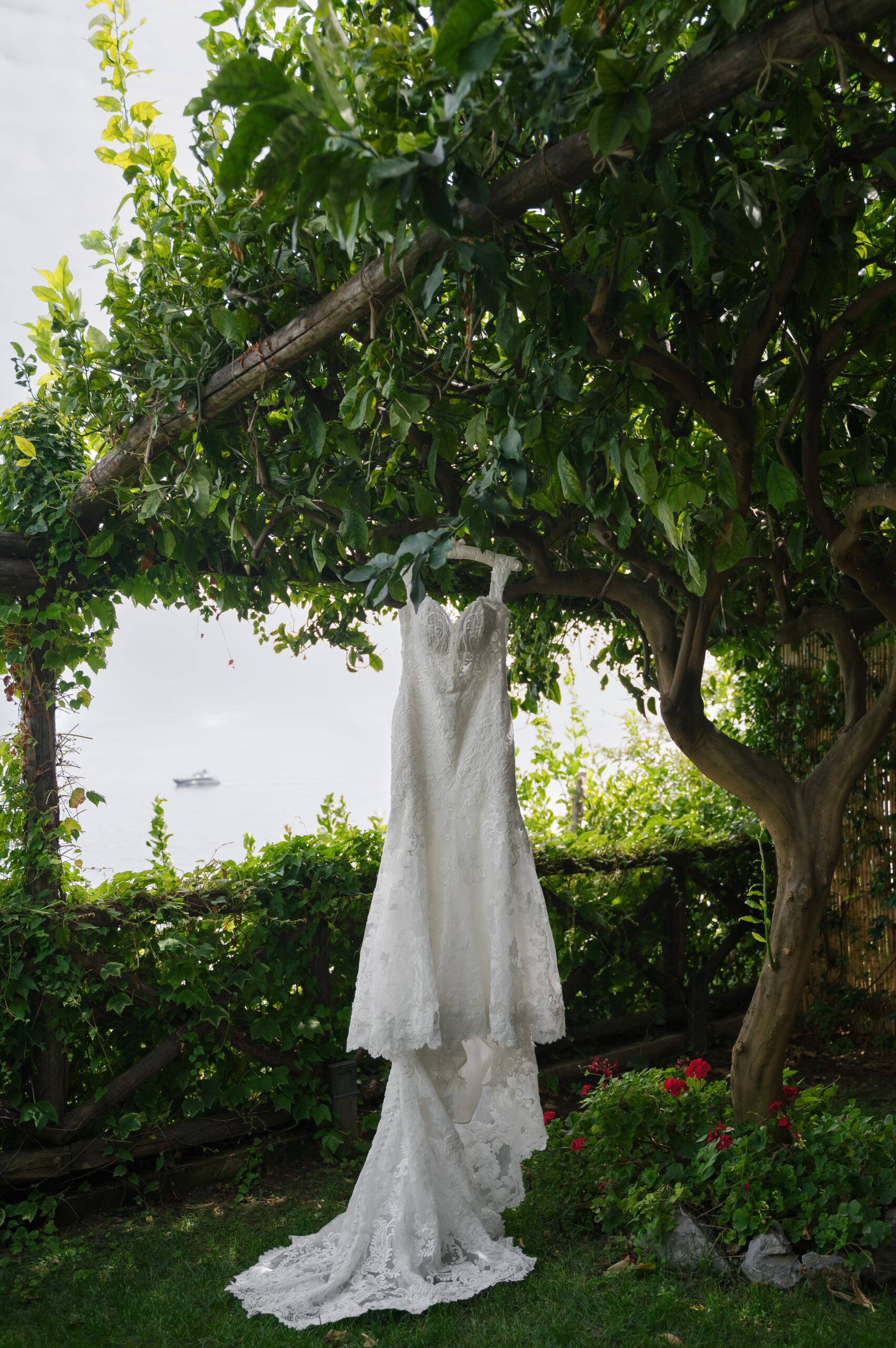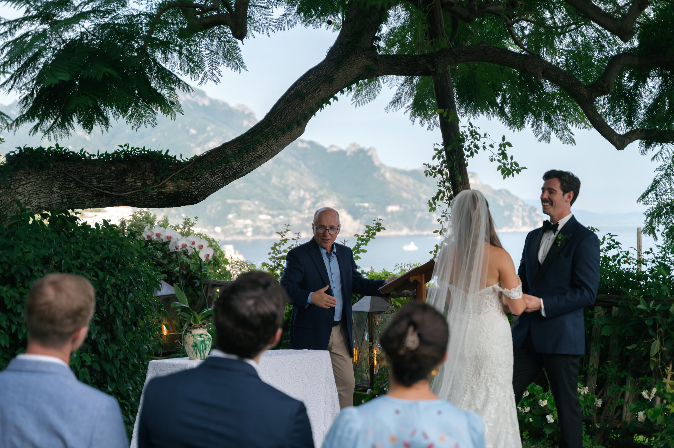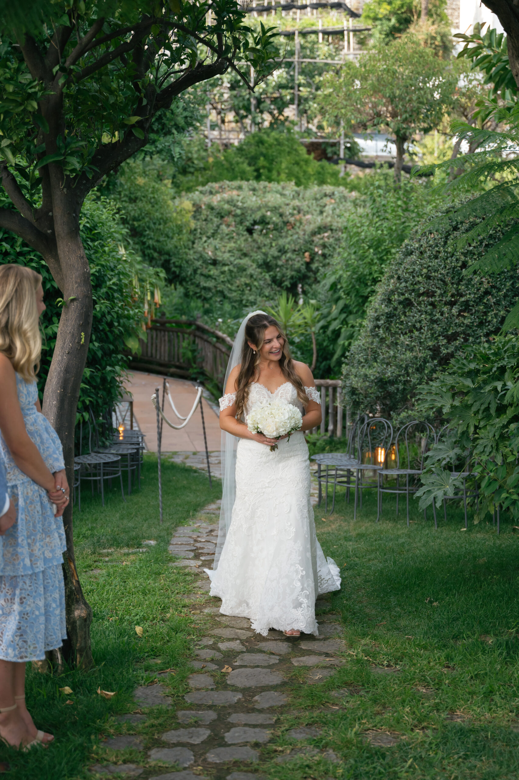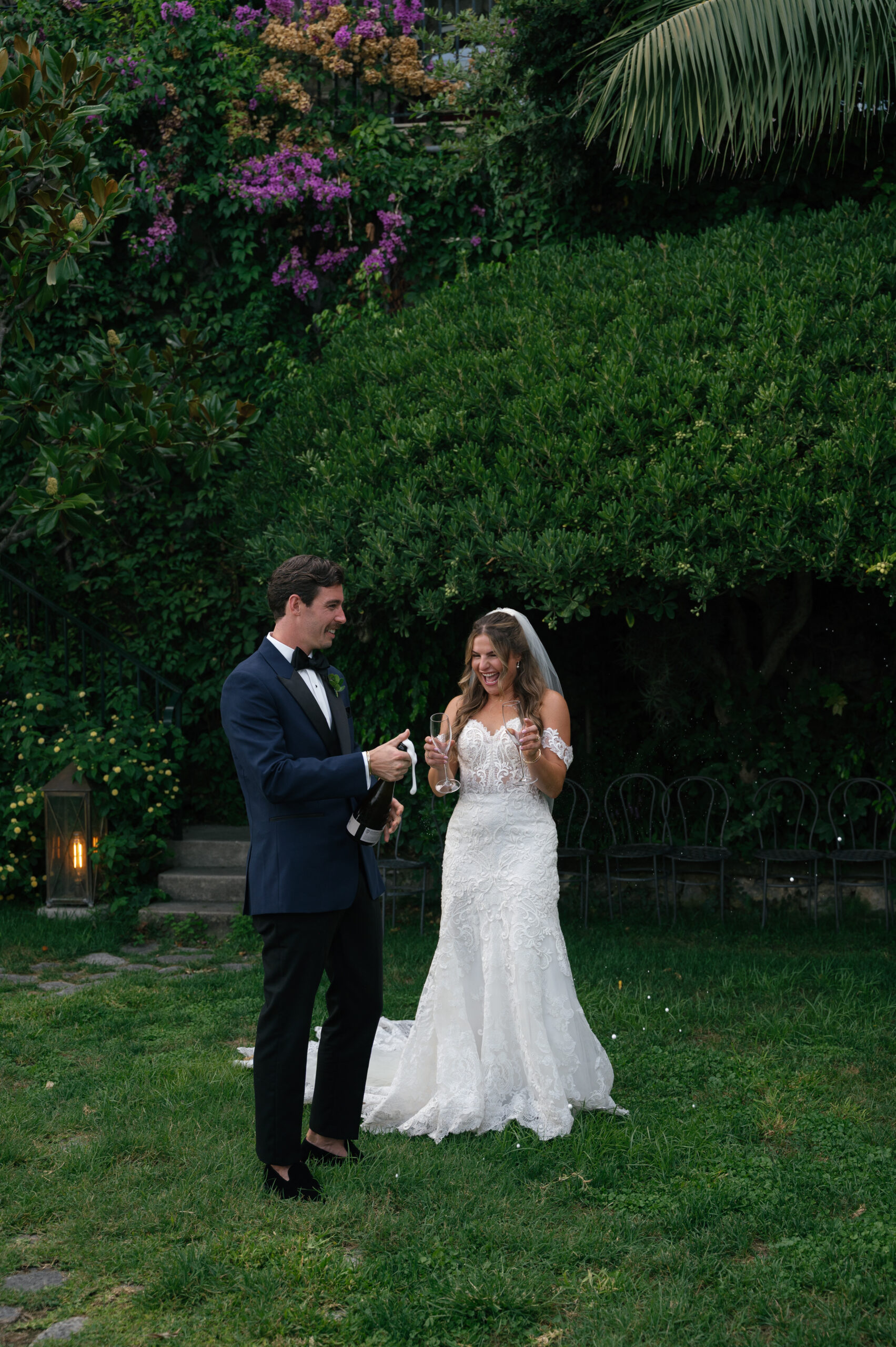 Their journey to Italy was not without obstacles – flight delays threatened to threaten their rhythm. But the team at Hotel Santa Caterina met them with kindness and grace, upgrading their room to a suite with a balcony that overlooked the sea. That room became “the moment before the moment”, the place where the dress’s lace breathed with sea air, where Mackenzie’s suit waited in soft light, where nerves and excitement softened into calm. Sometimes the universe repays hard journeys with unexpected gifts.