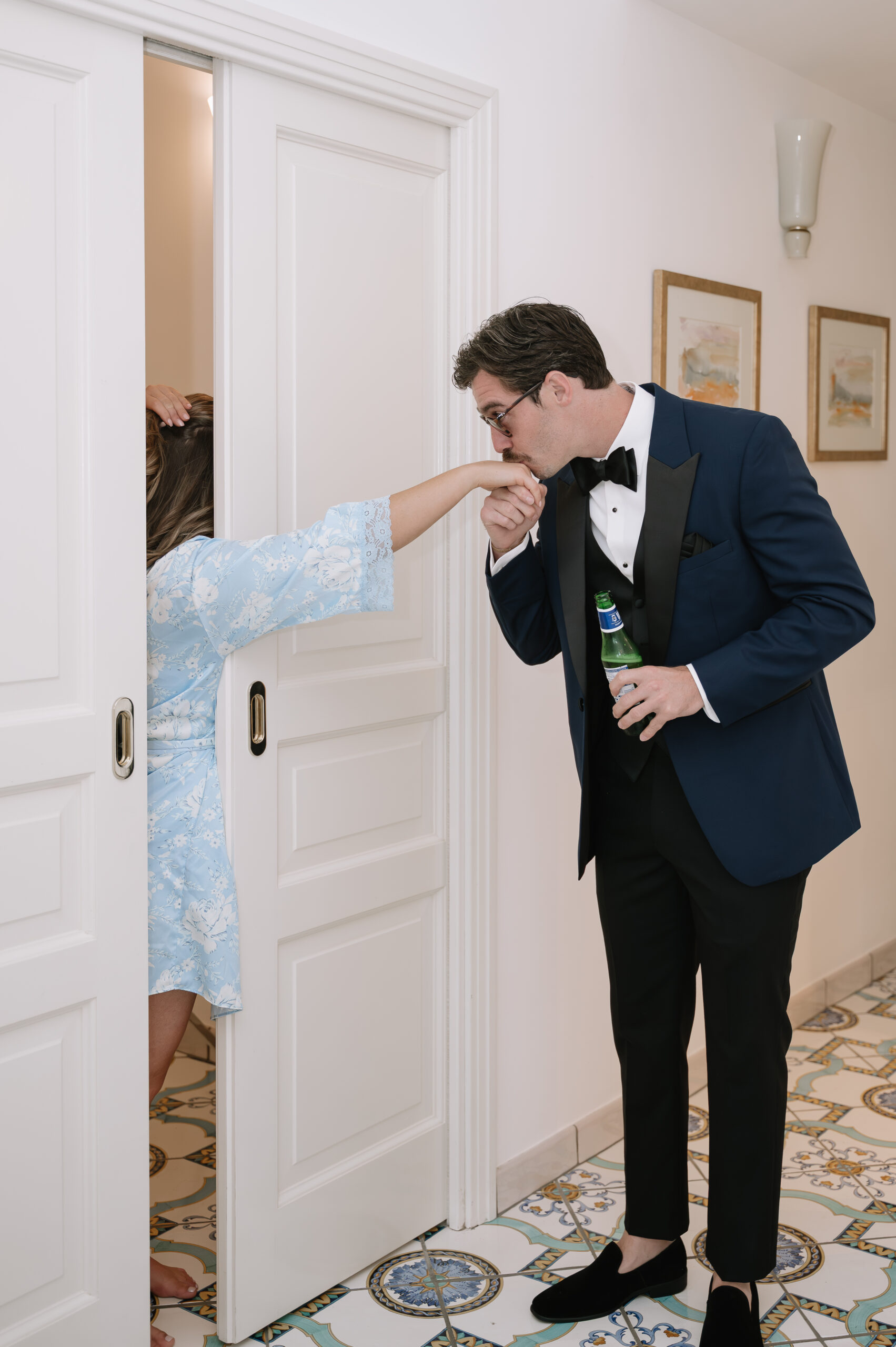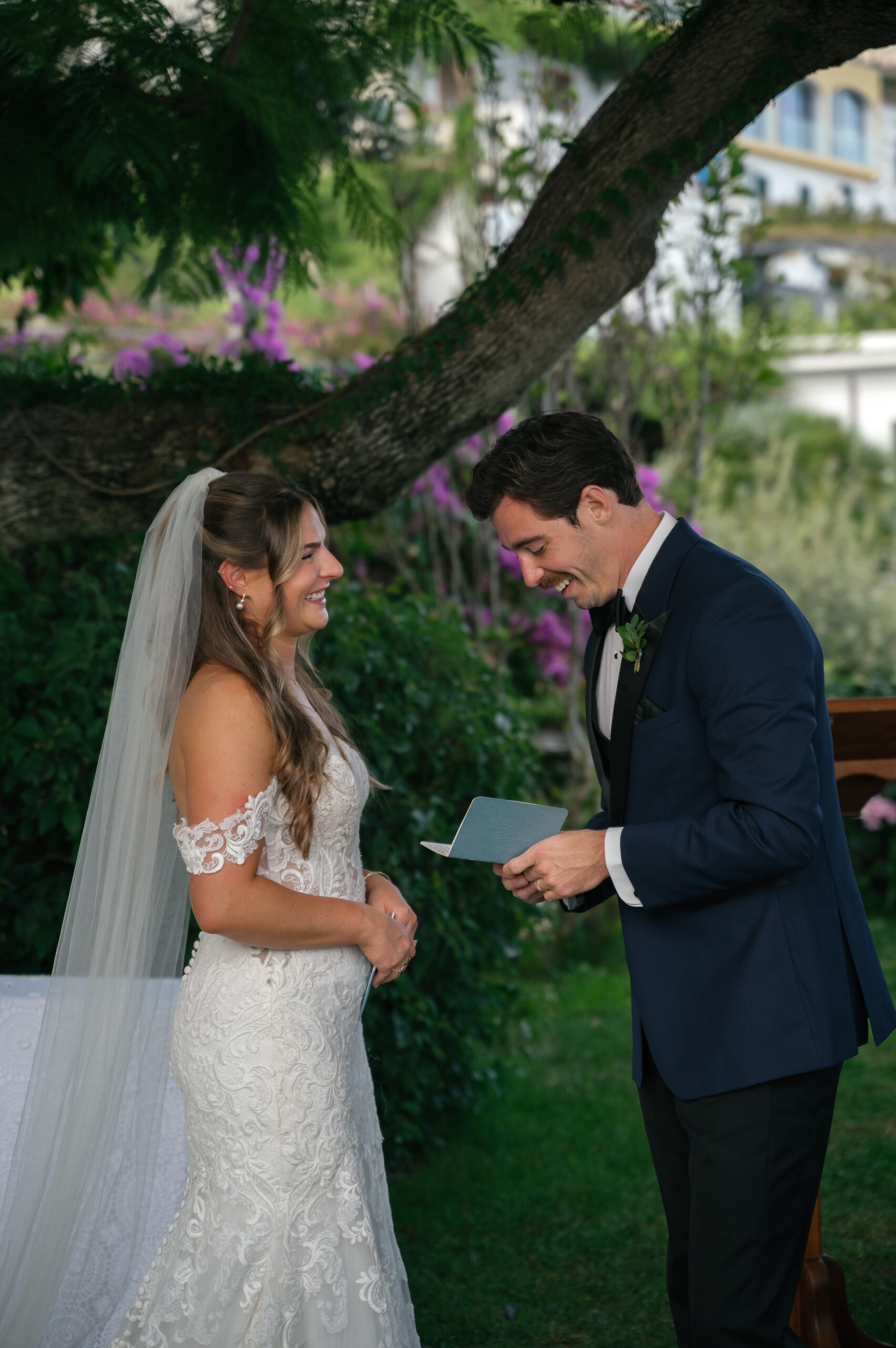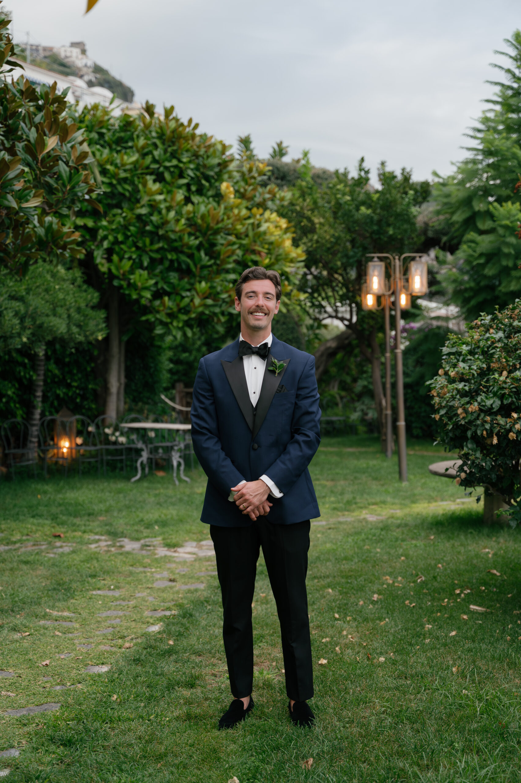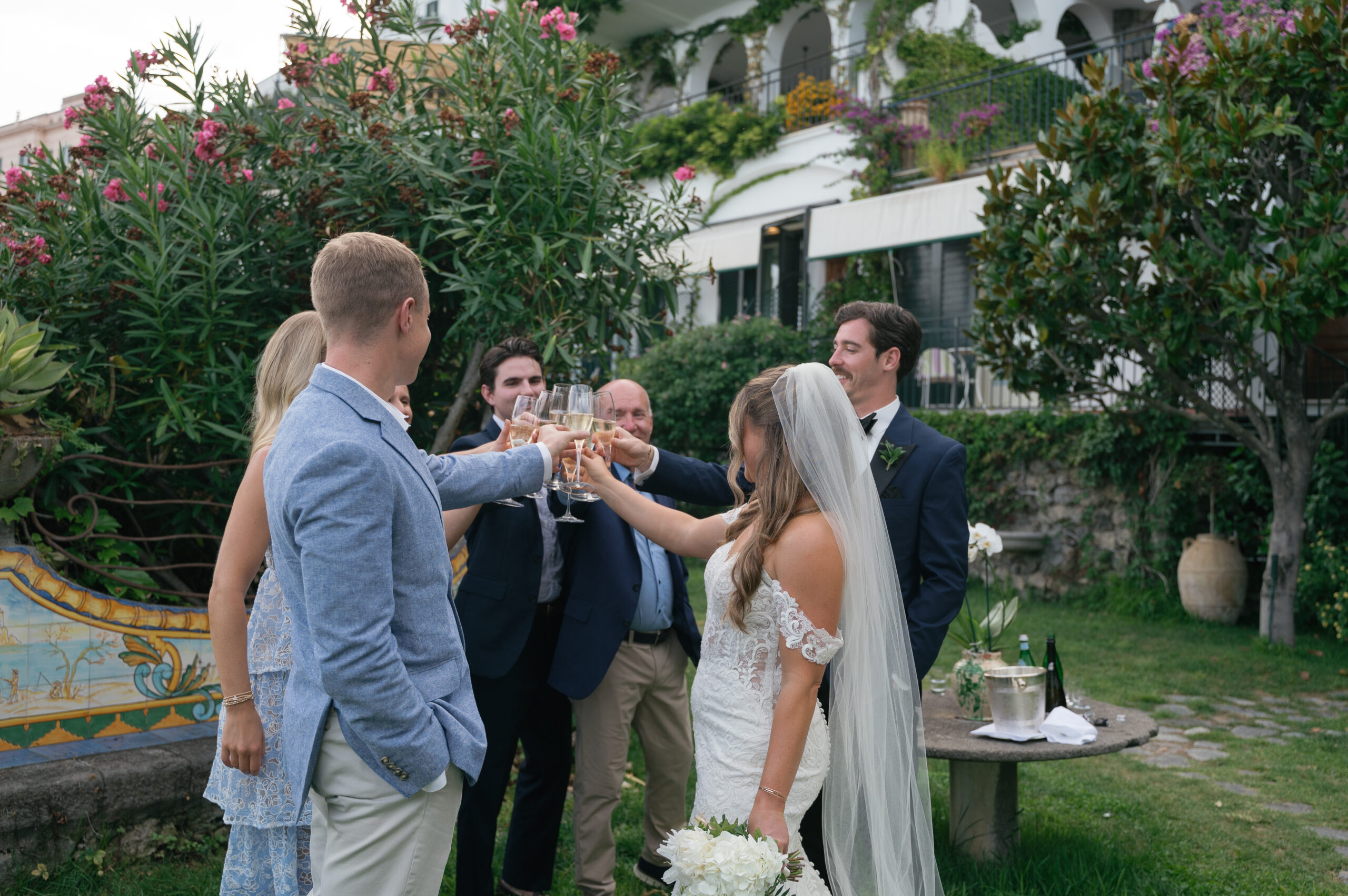 Their journey to Italy was not without obstacles – flight delays threatened to threaten their rhythm. But the team at Hotel Santa Caterina met them with kindness and grace, upgrading their room to a suite with a balcony that overlooked the sea. That room became “the moment before the moment”, the place where the dress’s lace breathed with sea air, where Mackenzie’s suit waited in soft light, where nerves and excitement softened into calm. Sometimes the universe repays hard journeys with unexpected gifts.